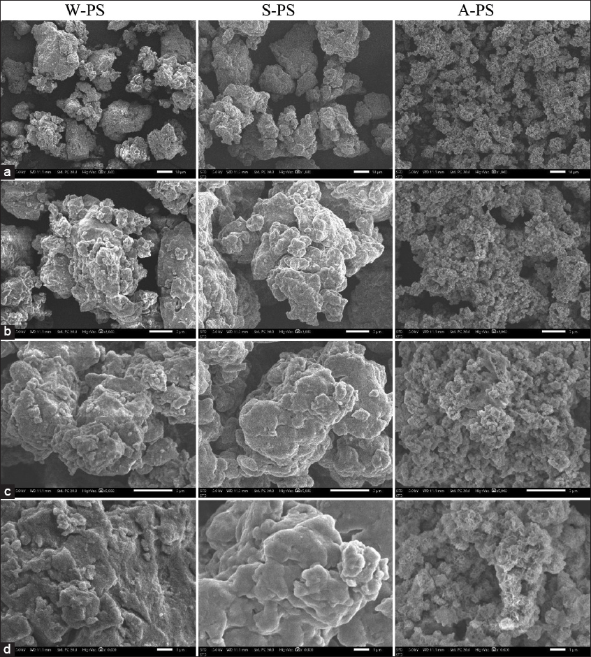 The water-extracted PS (W-PS) displayed relatively large, well-defined particles with rough surfaces, indicating minimal structural degradation and the formation of larger aggregates. In contrast, the Na2CO3-extracted PS (S-PS) exhibited more fragmented particles with irregular shapes, likely due to partial structural breakdown induced by the alkaline environment. The HCl-extracted PS (A-PS) showed the finest particles with significant agglomeration, suggesting substantial hydrolysis and chain fragmentation in the acidic environment [Figure 3].