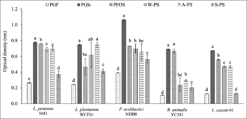 | Figure 4: Optical density (OD600) of probiotic strains grown in various media. PGF: Glucose-free MRS, PGlc: MRS supplemented with 1 g/L glucose, PFOS: MRS supplemented with 1 g/L fructooligosaccharide, W-PS: MRS supplemented with 1 g/L water extract, A-PS: MRS supplemented with 1 g/L HCl extract, S-PS: MRS supplemented with 1 g/L Na2CO3 extract. Different letters within the same strain indicate significant differences (Tukey’s Honestly Significant Difference, P < 0.05). [Click here to view] |