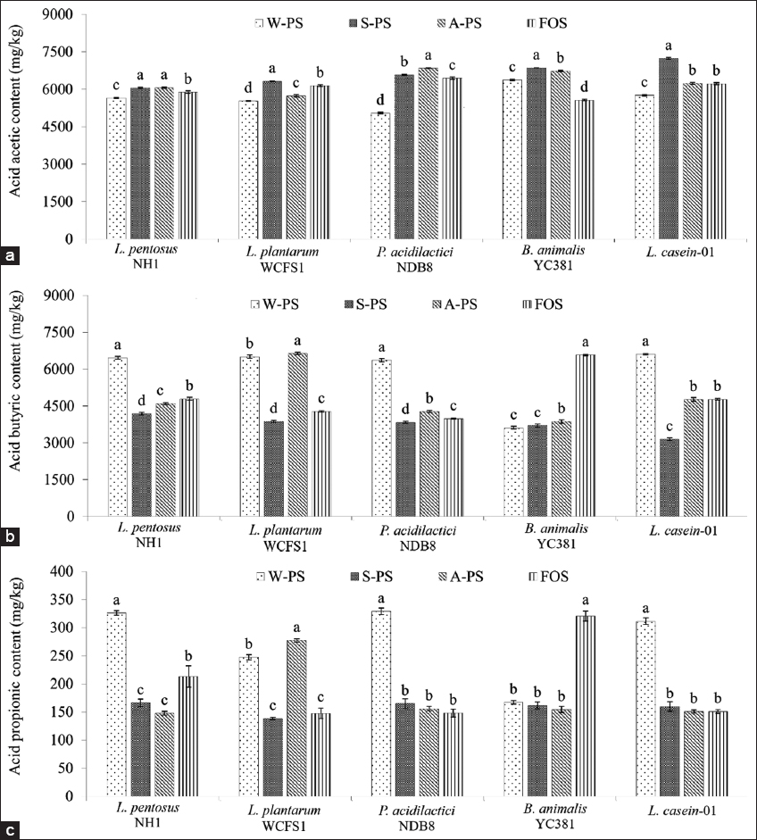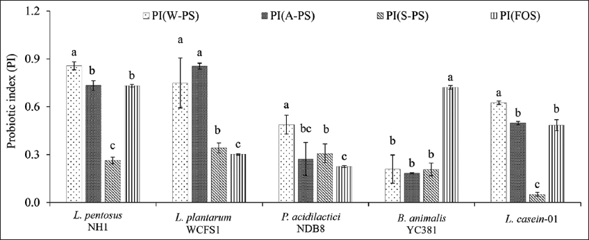 | Figure 5: Prebiotic index scores of probiotic strains grown in media supplemented with polysaccharide extracts. Different letters within the same strain indicate significant differences (Tukey’s Honestly Significant Difference, P < 0.05). [Click here to view] |