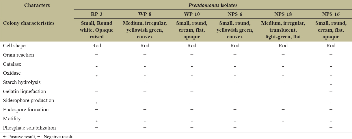 Six representative Pseudomonas strains were successfully obtained from the rhizosphere soils. All plants displayed PGP traits, as evidenced by the production of IAA, GA, and siderophores. NPS-18 notably exhibited phosphate solubilization ability with all other PGP traits [Figure 2], highlighting its potential as a robust bioinoculant.
