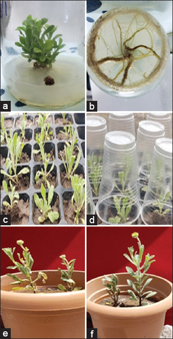 For micropropagation, seeds were supplemented with 0.5 mg/L Kin and 0.1 mg/L 1-naphthalene acetic acid (NAA) in MS medium. Callus was formed within 1–2 weeks [Figure 1c and d], followed by shoot formation and then root production after 3–4 weeks. Explants obtained from these calli were then subcultured with various types and concentrations of PGRs.