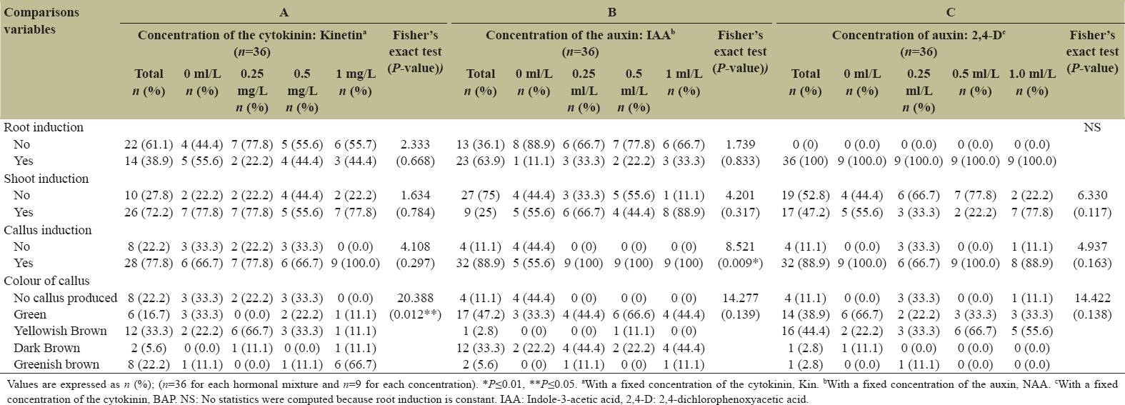Data were summarized in tables as frequencies and proportions. Crosstabulation and Fisher’s exact test were used to study the effect of different concentrations of the hormones on the non-parametric markers of plant growth. One-way analysis of variance, followed by Duncan’s Multiple Range test, was used to compare the means of the parametric values produced at various concentrations of the hormones. Data analysis was performed using the statistical software Statistical Package for the Social Sciences version 20.0, and P ≤ 0.05 was taken as significant.
