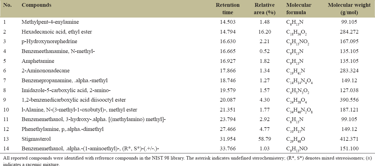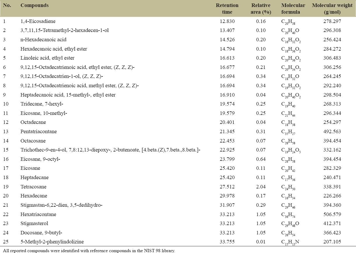 Ethanol and n-hexane extracts were made from shade-dried powder obtained from the mother and callus derived from micropropagated explants of P. jaubertii. The four extracts were prepared using the cold maceration method and then concentrated at 45°C using a rotary evaporator (Büchi, Switzerland). We determined the volatile phytochemicals following the procedure by Yisak et al. [42] with some modifications. GC-MS analysis was done using an Agilent 7890A gas chromatograph coupled with a 5975C mass spectrometer (Agilent, USA) equipped with electron ionisation (EI) for phytochemical analysis. Chromatographic separations were carried out using an HP-5MS (19091S-433) capillary column that is 30 m long, has a 0.25 mm internal diameter, and a 0.25-µm column phase film thickness. The injection mode was split-less, Helium served as the carrier gas, and we injected 1 µL of the sample at a consistent flow rate of 1 mL/min into an inlet heated to 275°C. The initial oven temperature was 60°C with a 2-minute hold time, then increased to 200°C with a ramp of 10°C/min and 3°C/min to 240°C. The ion source temperature was set to 230°C for the mass spectrometer settings, and the quadrupole temperature was 150°C. The system ran in positive electron impact mode at 70 eV, scanning from 40 to 650 m/z. The total run time was 45 minutes. Phytochemical components were qualitatively identified by comparing their retention times and mass spectral data with those in the NIST98 library.