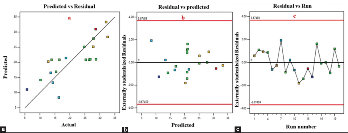 | Figure 3: (a) Graph of predicted and actual values, (b) Graph of predicted and residual values, (c) Graph of predicted and run values - experiment deviations.