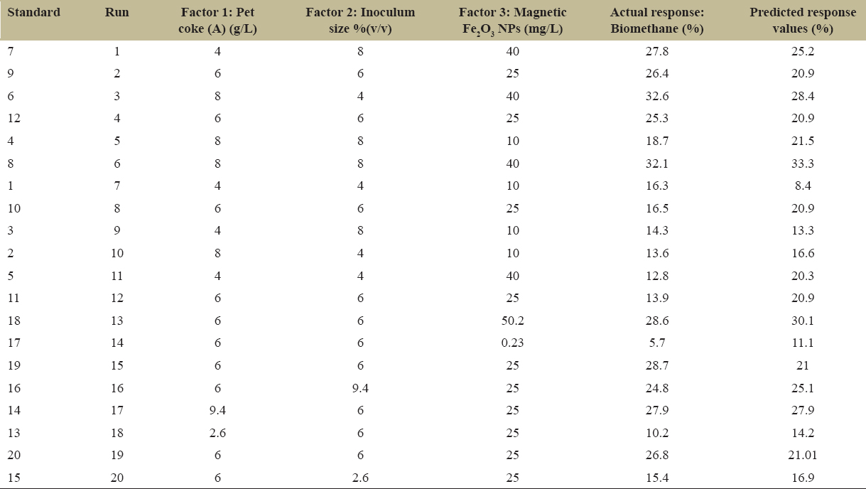 | Standard | Run | Factor 1: Pet coke (A) (g/L) | Factor 2: Inoculum size %(v/v) | Factor 3: Magnetic Fe2O3 NPs (mg/L) | Actual response: Biomethane (%) | Predicted response values (%) |