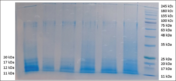 Hydrophobins extracted from P. ostreatus were analyzed using SDS-PAGE. The prominent protein bands at 11 kDa, 12 kDa, 17 kDa, and 20 kDa were observed in the polyacrylamide gel [Figure 1]. Lane number one has shown all bands, and other lanes showed faint bands of 17 and 20 kDa, while 11 and 12 kDa bands are prominently seen in all the lanes.