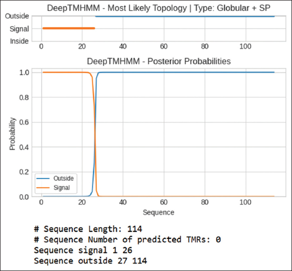 The presence of signal peptide in secreted protein was examined using the in silico program Signal P-5.0 (https://services.healthtech.dtu.dk/services/SignalP-5.0/). The Deep TMHMM-1.0 (https://services.healthtech.dtu.dk/services/DeepTMHMM-1.0/) server detected alpha helices and beta sheets of proteins spanning the lipid bilayer. The Bologna Unified Subcellular Component Annotator server was used to anticipate the subcellular localization and protein features.