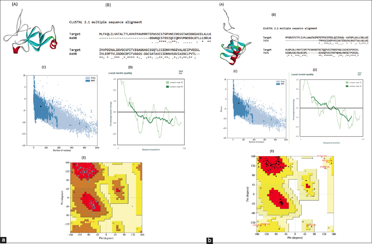 | Figure 5: (a): Structure analysis and validation of (A) predicted 3D structure of HYDPH6 Hydrophobin protein by Modeller 9.11. (B) pairwise sequence alignment with 6e98 using ClustalW, where the conserved amino acid residues are elucidated as (), highly similar residues as (:), and weakly similar residues as (.). (C) ProSA-Z-score plot shows the overall model quality Z score, i.e., −3.23, (D) Local model quality. (E) Ramachandran plot analysis of 3D structure of HYDPH6 Hydrophobin, where the red region defines the most favorable area of residues; the yellow region is additionally allowed; and generously allowed residues in the light-yellow region. (b) Structure analysis and validation of (A) predicted 3D structure of Vmh2 protein by Modeler 9.11. (B) pairwise sequence alignment with 7s7s using ClustalW, where the conserved amino acid residues are elucidated as (), highly similar residues as (:) and weakly similar residues as (.). (C) ProSA-Z-score plot shows the overall model quality Z score i.e. −2.13, (D) Local model quality. (E) Ramachandran plot analysis of 3D structure of Vmh2, where the red region defines the most favorable area of residues; the yellow region is additionally allowed; and generously allowed residues in the light-yellow region.