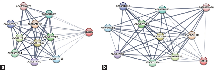 | Figure 6: (a) Protein-protein interactions of Hydph6. (b) Protein-protein interactions of Vmh2.