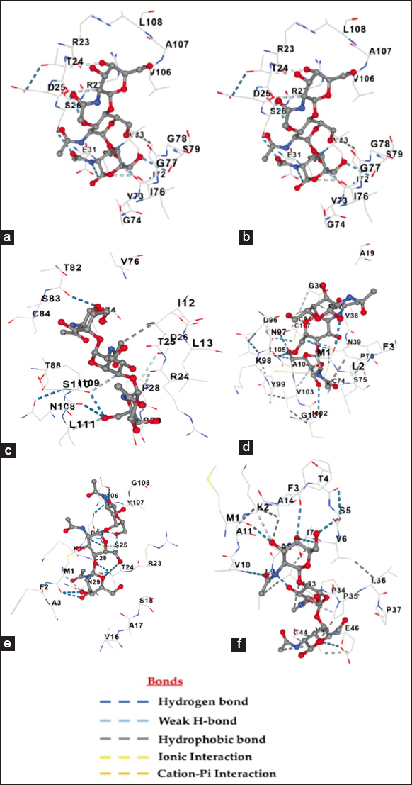 On the other hand, Vmh2, Hydph7, and Hydph16 had lower binding scores of −6.3 Kcal/mol, −6.6 Kcal/mol, and −6.7 Kcal/mol, respectively, showing they have moderate-to-limited binding abilities [Figure 7c, e and f]. Even though Hydph7 had a lot of contact residues (38), its low docking score hints at possible structural issues that might be preventing it from interacting well with chitin [Table 4]. Similarly, Hydph16’s average score could be due to structural limitations. In summary, Hydph6 is the most promising protein for interacting with chitin, followed by Vmh3-1, while the other proteins might need some structural changes to enhance their binding capabilities [17].