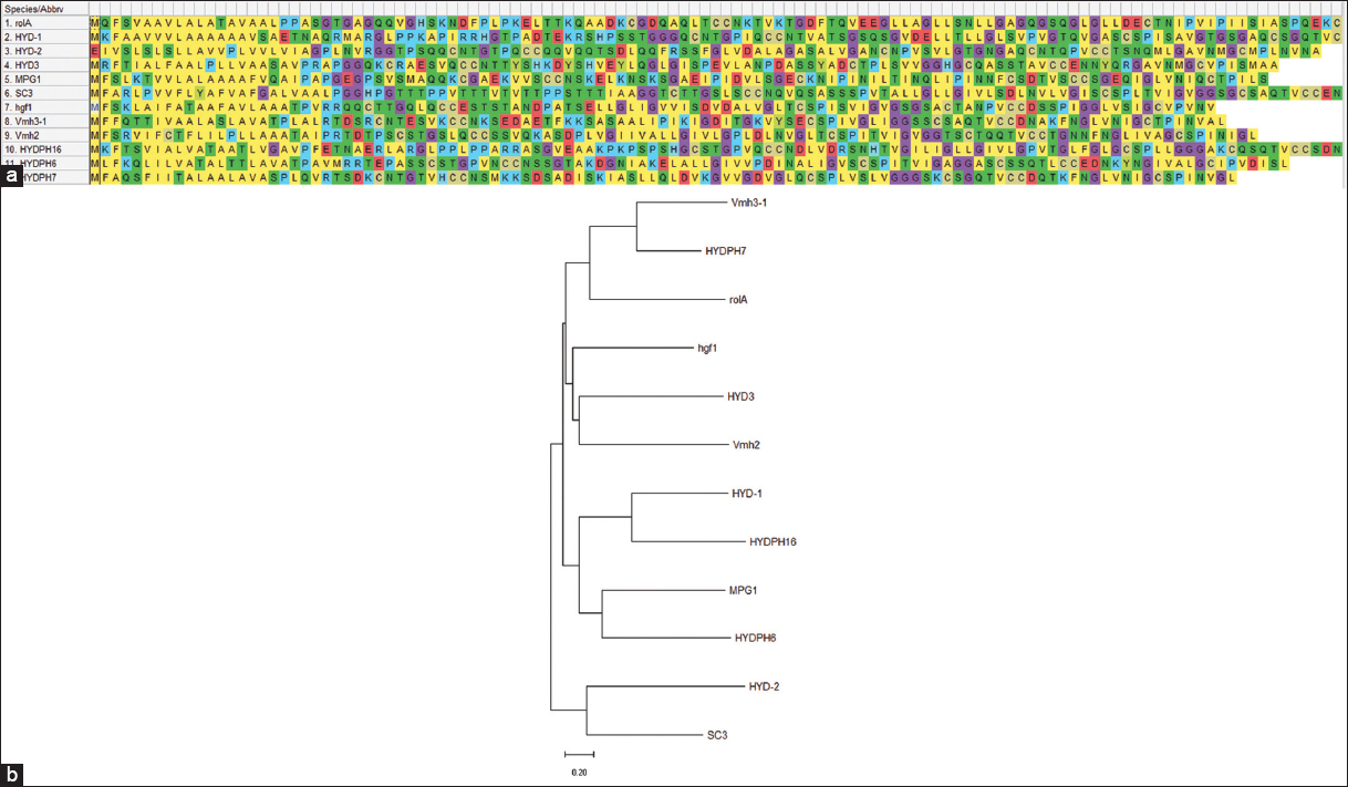 | Figure 8: (a) Amino acid alignment performed for HPs: Hydph6, Hydph7, Hydph16, Vmh2, and Vmh3-1. (b) Phylogenetic tree obtained after alignment of different hydrophobin sequences with Hydph6, Hydph7, Hydph16, Vmh2, and Vmh3-1.