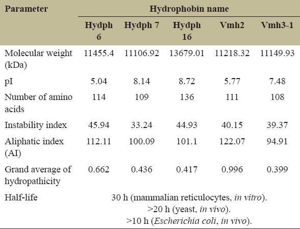 Table 2: Physicochemical parameters of hydrophobins studied using Protparam.