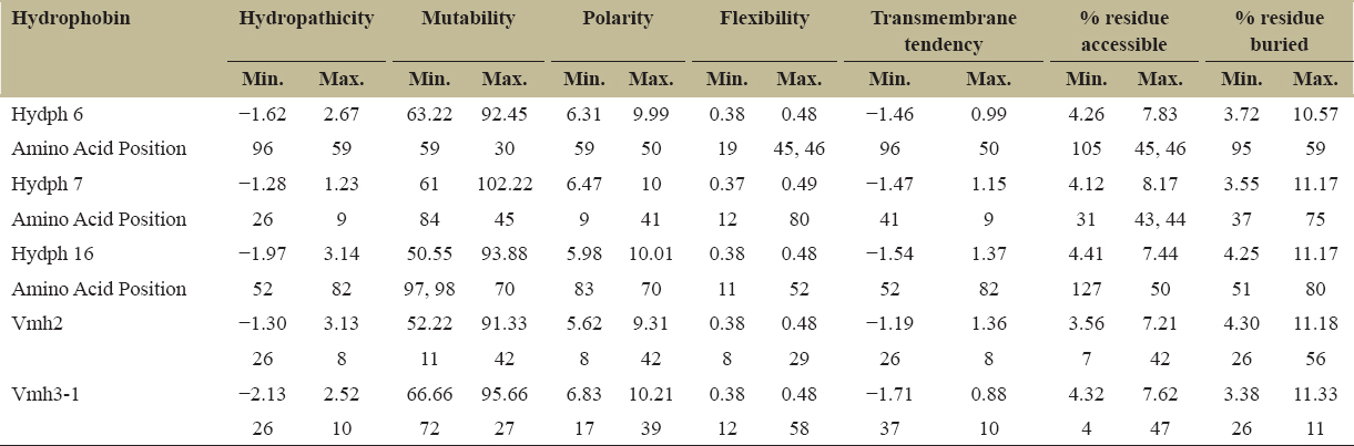 | Hydrophobin | Hydropathicity | Mutability | Polarity | Flexibility | Transmembrane tendency | % residue accessible | % residue buried |