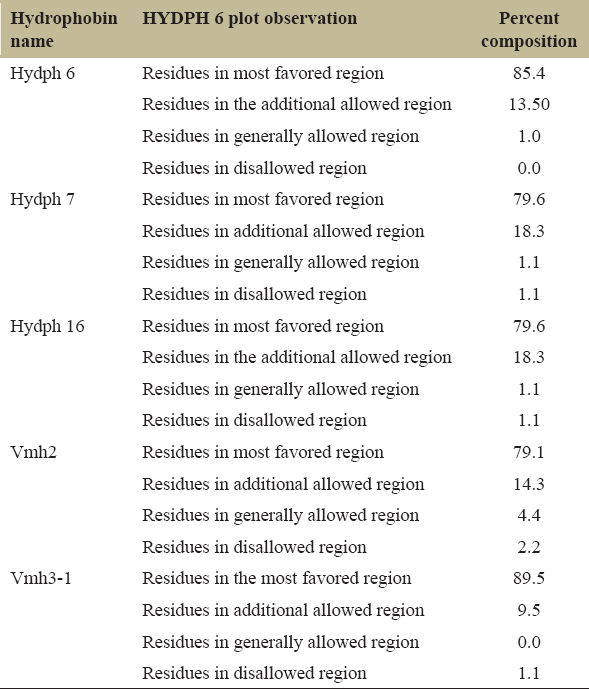 The functionality and various other properties of the proteins are dependent on their two and three-dimensional structures. The 2D structures of Hydph6, Hydph7, Hydph16, Vmh-2, and Vmh-3-1, were predicted using the Phyre2 server. It also helped to determine the percentage of alpha-helices, beta strands, and random coils present in the selected hydrophobins. The results of 2D structures showed that Hydph6 and Vmh2 had the highest percentage of alpha-helices [Figure 4a and b] while Vmh3-1 and Hydph7 showed the highest percentage of beta-strands and disordered coils [Figure S8 and S10].