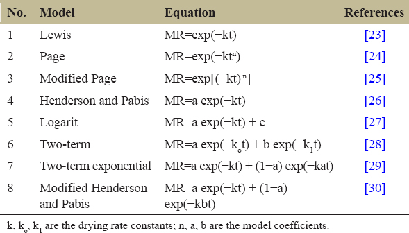 Table 1: Typical drying curve models provided by several authors.