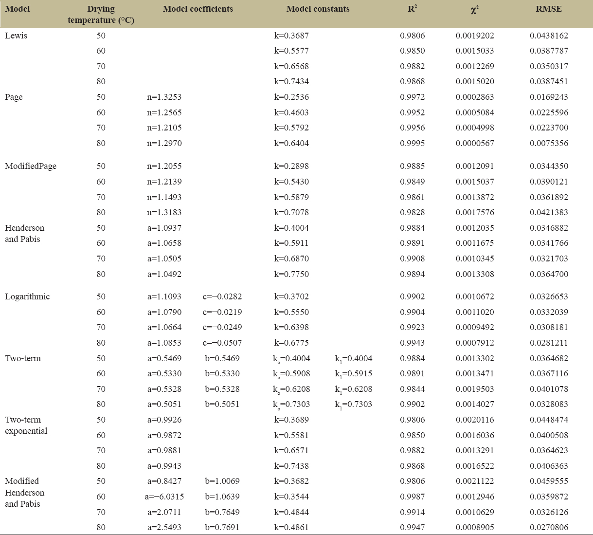 | Model | Drying temperature (°C) | Model coefficients | Model constants | R2 | χ2 | RMSE | ||