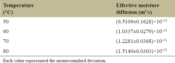 The activation energy was computed based on the Arrhenius equation (10), which represents how temperature affects effective moisture diffusivity [20]. Where Ea is the activation energy (kJ/mol), Do is the Arrhenius factor (pre-exponential factor, Do is equivalent to the diffusion at infinitely high temperature) (m2/s), R is the ideal gas constant (R = 8.314 J/mol.K), and T is the absolute temperature (K).