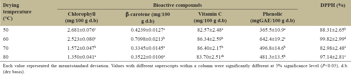 | Figure 2: Variation in moisture ratio as a function of drying time at different temperatures. [Click here to view] |