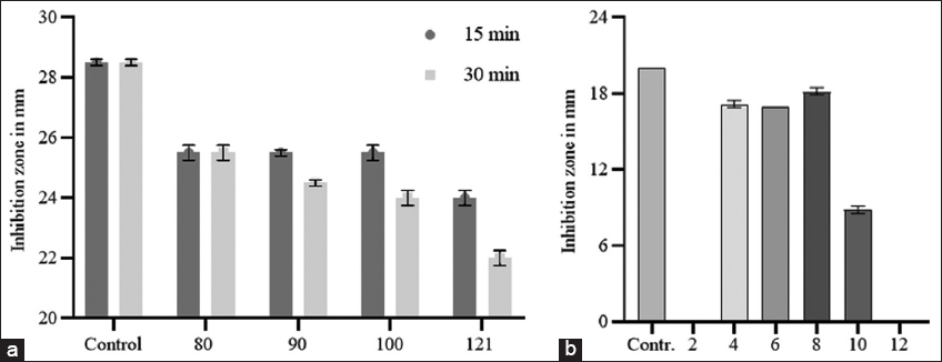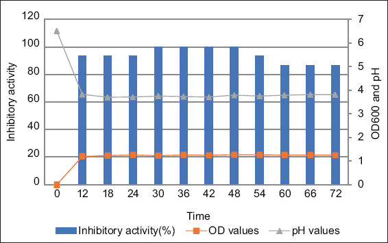 The growth dynamics of L. plantarum K-2 showed that the strain entered the stationary phase after 12 h of incubation, with culture density remaining relatively stable from 12 to 72 h [Figure 2]. Similarly, the pH of the culture medium decreased sharply from 6.5 to 3.65 within the first 12 h, followed by only slight changes throughout the remainder of the incubation period, reaching a final value of approximately 3.5.