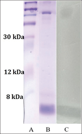 Molecular weight determination was carried out in sodium dodecyl sulfate-polyacrylamide gel electrophoresis (SDS-PAGE) electrophoresis. A 15% separating gel was prepared accordingly. The gel was stained with diamond blue Coomassie R-250 to determine the size of the molecule, and washed for 60 min with a triple change of distilled water. Then, 25 mL of a soft agar medium inoculated with an indicator strain was applied after removing the water and incubated for 18–24 h to match the molecular weight and antibacterial activity. The molecular weight of plantaricin K-2 was determined by time-of-flight mass spectrometry as described in our previous work [2].