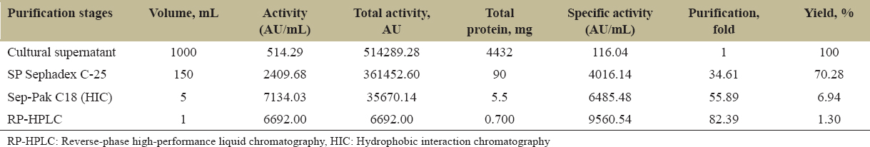 For initial purification, the CFC was diluted 2 times using 20 mM phosphate buffer (pH 6.5) and applied to a pre-equilibrated SP-Sephadex C-25 cation-exchange column (20 mL; GE Healthcare, Sweden) equilibrated with the same buffer. The column was washed with two column volumes of 20 mM phosphate buffer (pH 6.5), and proteins were eluted stepwise using increasing concentrations of sodium chloride (NaCl) (0.1, 0.3, 0.6, 0.8, and 1.0 M) in 20 mM phosphate buffer, pH 6.5, at a flow rate of 1 mL/min. Eluted fractions were collected and assessed for antibacterial activity against the designated indicator strain. Active fractions were pooled and subjected to further purification.