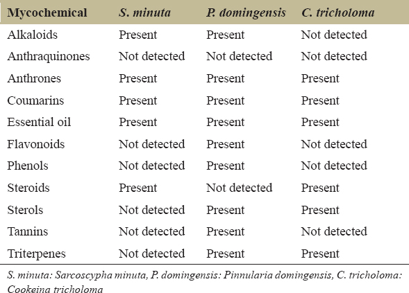 Table 2: Biochemical constituents of the ethanolic extract of mycelia of S. minuta, P. domingensis, and C. tricholoma.
