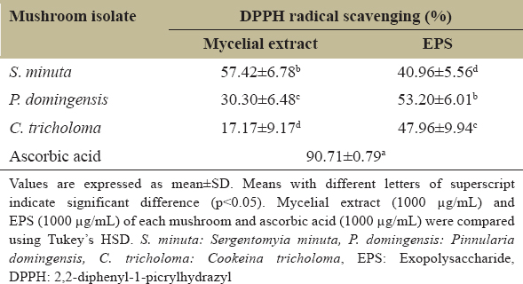 Table 3: DPPH radical scavenging activity of mycelial extract and EPS of the three mushrooms.