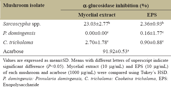Table 4: α-glucosidase inhibitory activity of mycelial extract and EPS of the three mushrooms.