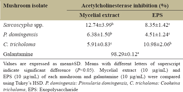 Table 5: Acetylcholinesterase inhibitory activity of mycelial extract and EPS of the three mushrooms.