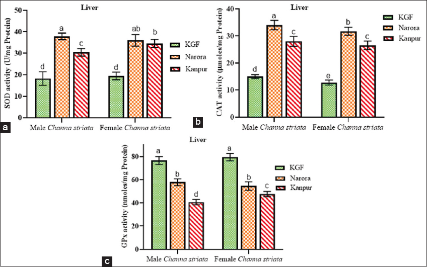 | Liver | Narora | B60.74±1.03b | A150.76±0.67b | C40.39±0.97b | D33.22±0.59b | F26.41±0.56b | E32.78±1.57b |