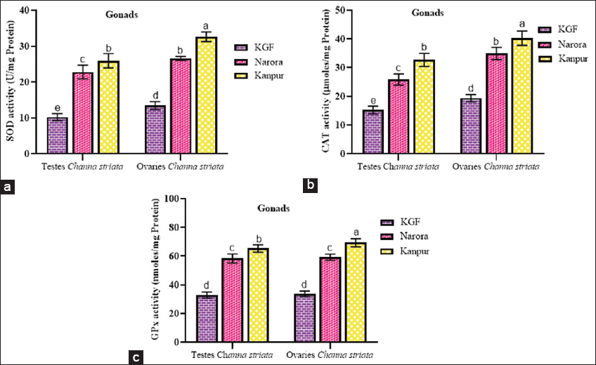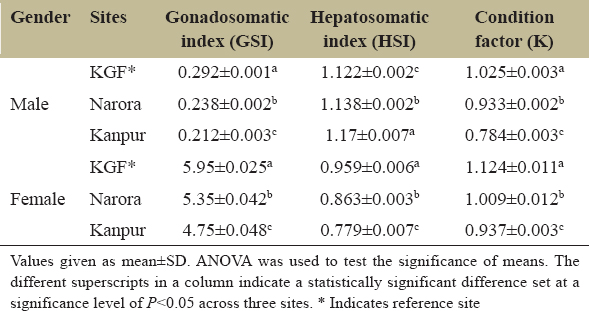 Anthropogenic activities and natural calamities tend to influence and degrade water resources across the globe [1]. Water from the Ganga River is used for several activities such as sustenance, agriculture, and industries [2]. Many cities and towns situated on the banks of the Ganga influence water quality, as wastes are often directly discharged into the river. Even when treatment plants are present, their efficiency is limited. In the Ganga basin, around 12,000 million L/day (MLD) of sewage is generated, while the treatment capacity is only about 5,000 MLD [3]. The contributions from municipal sewage and industrial effluents are approximately 70–80% and 15–20%, respectively [4-6]. In Kanpur city, which is one of the major urban and industrial centers along the Ganga, municipal solid waste generation has been estimated at approximately 1,400–1,500 tonnes/day [7], further exacerbating the pollution burden in this stretch of the river. These xenobiotics, especially heavy metals, influence aquatic life by disrupting physiological processes. There are several reports on parameters such as temperature, dissolved oxygen (DO), total dissolved solids (TDS), pH, and conductivity influencing fish health [8,9], supporting the use of fish as bioindicators of water bodies. This is primarily due to the bioaccumulation of heavy metals in fish tissues, as they are non-biodegradable entities. Presence of trace and heavy metals in different tissues of fish has been observed by several workers [10,11]. The metals tend to influence several health conditions in fishes; however, this study intends to observe the effect on molecular, physiological, and biochemical responses in brooders. Bioindices such as hepatosomatic index (HSI), gonadosomatic index (GSI), and condition factor (K) are used for studying metabolic activities, reproductive and general health of fishes.