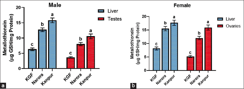 The elevation of MT observed across tissues and genders reflects a physiological defense mechanism against heavy metal exposure. MT binds and sequesters metals such as Cu, Cd, Pb, and Cr, thereby reducing their toxic effects. A study also found that exposure to heavy metals in Prochilodus costatus increased MT levels [56]. The progressive increase in MT from KGF to Narora and Kanpur corresponds with the rising metal burden along this pollution gradient, suggesting its usefulness as an indicator of metal exposure. Although the liver is the primary detoxification organ and accumulates higher metal concentrations, comparatively greater MT induction in the ovary can be attributed to reproductive physiology. During the breeding season, MT concentrations in the liver tend to decrease to release Zn, which is required to stabilize membrane structures involved in Vtg synthesis and secretion [57,58]. As a result, ovarian MT levels remain elevated, which may contribute to maintaining metal homeostasis within the gonads and support reproductive processes under contaminated conditions. The positive correlations observed between heavy metals and MT levels across liver and gonadal tissues further support this association. The strong correlation indicates that MT synthesis increased in direct proportion to metal burden, confirming that MT induction is a metal-responsive regulatory mechanism rather than a random physiological variation.