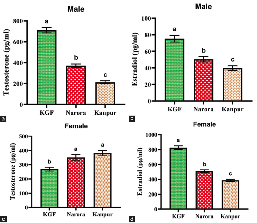 The size of C. striata used in the study ranged from 32.0 to 36.7 cm across different sampling sites, and approximately 1.5–2.5 mL of blood was collected from each specimen. Blood was drawn from the caudal vein of live fish using a syringe and allowed to rest at room temperature for 1 h. The samples were then centrifuged (Agile, CentriteQ) at 1,000–2,000 × g for 10 min to obtain the serum, which was immediately transferred to a clean polypropylene tube using a Pasteur pipette. Hormonal analysis (testosterone and estradiol) was carried out using the Elecsys kit (Roche Diagnostics Ltd., India).