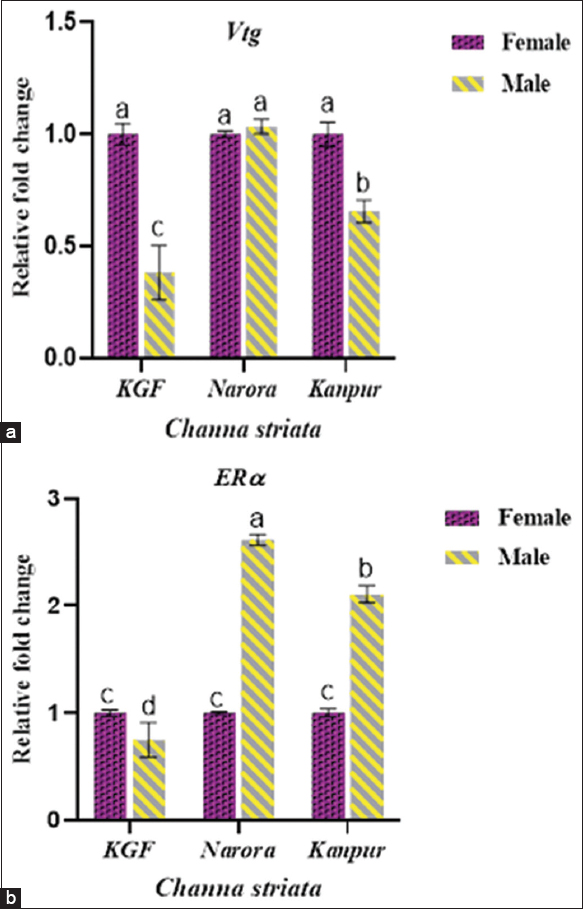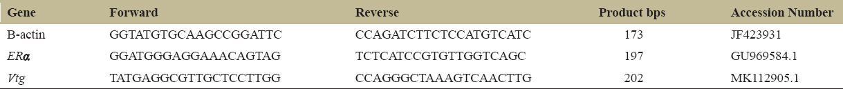 Total RNA from liver was extracted using Trizol (Sigma) by vigorously shaking it and centrifuging in acidic conditions. The upper aqueous phase was collected, treated with an equal volume of isopropyl alcohol, and incubated at −20°C for 30 min. The mixture was then centrifuged at 10,000 RPM at 4°C for 10 min. After centrifugation, the supernatant was discarded and the collected pellet was dried, and then nuclease-free water was added to it [33]. The obtained RNA integrity was checked using agarose gel electrophoresis. For gel preparation, 1 g of agarose was added to 100 mL of 1X TAE (Tris-Acetate EDTA) buffer to prepare a 1% agarose gel. Out of this, 50 mL of molten gel was poured into a casting tray (Medox Biotech India Pvt. Ltd.) containing 2 μL of ethidium bromide and allowed to solidify for 20 min with a comb in place. After solidification, 2 μL of 6X DNA loading dye and 10 μL of RNA sample were loaded into each well. Electrophoresis was carried out at 110 V for 45–60 min, and the bands were visualized under UV light. The Orcinol method was used for quantification of RNA [34]. dT column was used for the isolation of mRNA. For cDNA synthesis by reverse transcription, 4ug of each sample was used using RevertAid™ First Strand cDNA Synthesis Kit (Thermo Scientific, Cat. No. K1621) in a thermocycler (MWG Biotech). The synthesized cDNA was used for quantification of Vtg, ERα, and the β-actin genes using real time quantitative PCR (RT-qPCR, AB-Applied Biosystem, 7000 system software). The primers (forward and reverse) were designed using Primer Express 3.0, as indicated in Table 1. Melting curve analysis was performed over a range of 45–95°C to study the target amplification specificity. 7000 System Software was used to obtain threshold cycle (Ct) values. Corresponding Ct values of β-actin were used to normalize each Ct value of the target gene. The 2-??Ct method was used to determine the relative expression levels of target genes [35].