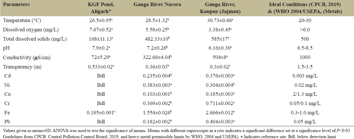 The physicochemical parameters of the water samples from the three study sites, KGF Pond (reference site), Ganga River at Narora, and Kanpur (Jajmau), differed significantly (P < 0.05), as summarized in Table 2.