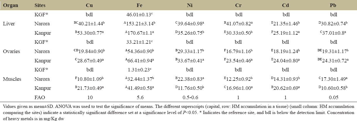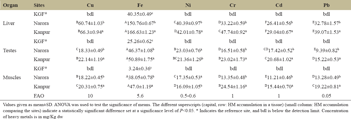 The analysis of heavy metal accumulation in both brooders collected from Kanpur and Narora revealed significant (P < 0.05) differences in the levels of Cu, Fe, Ni, Cr, Cd, and Pb across different tissues and sites, with Kanpur showing mostly higher levels due to greater industrial activities, particularly tanneries.