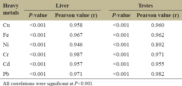 Correlation analysis showed that MT levels in the testes of male C. striata were positively and significantly correlated with all the heavy metals studied (Table 6, P < 0.001). The correlation coefficients were r = 0.960 (P < 0.001) for Cu, r = 0.962 (P < 0.001) for Fe, r = 0.892 (P < 0.001) for Ni, r = 0.971 (P < 0.001) for Cr, r = 0.955 (P < 0.001) for Cd, and r = 0.982 (P < 0.001) for Pb. These results indicate that MT levels in the male testes increased consistently with increasing heavy metal accumulation.