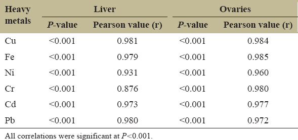 Correlation analysis showed that MT levels in the ovaries of female C. striata were positively and significantly correlated with all the heavy metals studied (Table 7, P < 0.001). The correlation coefficients were r = 0.984 (P < 0.001) for Cu, r = 0.985 (P < 0.001) for Fe, r = 0.960 (P < 0.001) for Ni, r = 0.980 (P < 0.001) for Cr, r = 0.977 (P < 0.001) for Cd, and r = 0.972 (P < 0.001) for Pb. These results indicate that MT levels in the female ovaries increased correspondingly with increasing concentrations of heavy metals.