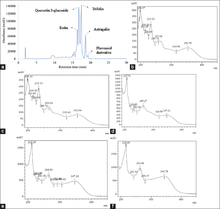 | Figure 3: High-performance liquid chromatography (HPLC) chromatogram of senggani extracts at 260 nm (a) and ultraviolet visible (UV-Vis) spectra of individual phenolic compounds detected in Melastoma malabathricum (purple senggani) flower extract using HPLC-diode array detector: rutin (b), quercetin 3-glucoside (c), trifolin (d), astragalin (e), and a flavonoid derivative (f). The spectra indicate the characteristic absorbance features of flavonoid compounds in the UV region. [Click here to view] |