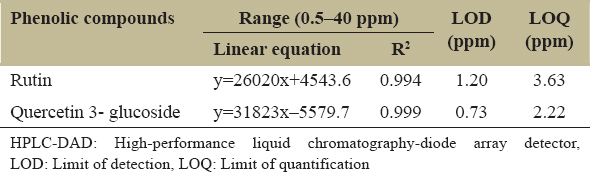 Table 1: Analytical performance of the HPLC-DAD method for the quantification of rutin and quercetin 3-glucoside.