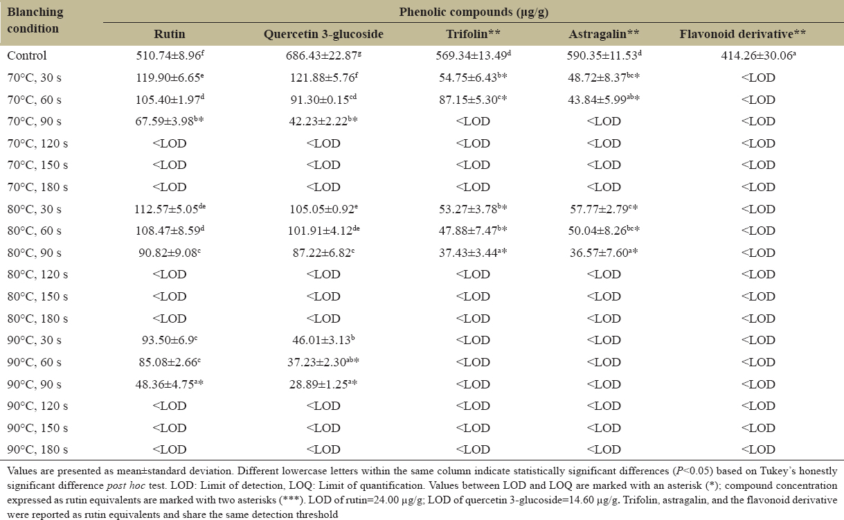Blanching markedly decreased the concentration of these phenolics [Table 2]. Under control conditions (no blanching), rutin and quercetin 3-glucoside were the dominant flavonoids, with concentrations of 510.74 ± 8.96 and 686.43 ± 22.87 μg/g, respectively. However, as blanching time increased, the concentration of these flavonoids clearly reduced, particularly at higher temperatures. At 70°C, after 30 s, the rutin concentration dropped significantly to 119.90 ± 6.65 μg/g and quercetin 3-glucoside decreased to 121.88 ± 5.76 μg/g. Longer blanching durations and higher temperatures led to further losses, with most flavonoids falling below the LOD beyond 120 s of blanching.