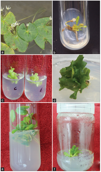A healthy growing plant in the Aquagene (Aquatic Plant Conservatory of Malabar Botanical Garden and Institute for Plant Sciences) introduced from the original locality is used as the explant source. Nodal cuttings from fresh sprouts (3rd and 4th leaf) were used as explants [Figure 1a]. The leaves were collected, washed in running water for 25 min and the nodal region was separated and treated with Tween 20 (2-3 drops in 1 L distilled water) for 15 min followed by washing with double distilled water 3-5 times. Surface sterilization of explants was done with 0.1% (w/v) HgCl2 for 2-3 min and washed thrice with sterile double distilled water before inoculation inside the laminar air flow chamber. The nodal segments were trimmed into two equal vertical halves of about 1 cm long aseptically and used directly as the explant. The surface sterilized explants were inoculated in Murashige and Skoog (MS) basal medium [8] and MS medium with combinations of auxins (indole 3-butyric acid [IBA]*, naphthalene acetic acid [NAA]**) and cytokinins (benzyl aminopurine [BAP]***) were tried for shoot or root induction. Once shoot formation was noticed, they were subcultured in the rooting medium with auxin after the formation of roots and they were transferred to basal MS medium containing low concentration (4.5 mg/L) of agar. After 2-3 weeks, the fully developed plants were transferred to pots with sterile clay and kept in the greenhouse for hardening.