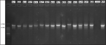 The DNA was extracted (bioron sample preparation Kit-Korea) and purified. The 16S rRNA gene was amplified by polymerase chain reaction (PCR) run with two universal bacterial primers: 8F (5’AGAGTTTGATCCTGGCTCAG-3’) and 1492R (5’GGTTACCTTGTTACGACTT-m3’) [21]. PCR solution contained 5 μl template DNA, 17 μl dH2O, 1 μl primers, 1 μl dNTP, 0.75 μl MgCl2 (50 mM), 25 μl PCR amplification buffer (1X), and 2 U Taq DNA polymerase. Amplification was carried out with Techne TC-3000X thermal cycler (UK) as follow: Initial denaturation at 95°C for 5 min, followed by 30 1-min cycles at 95°C, 30 s at 58°C, 1 min at 72°C, and 10 min at 72°C for the final extension [22]. After electrophoresing [Figure 1], PCR products - single 1400 bp of DNA fragments - were then purified using Gene All Gel Extraction Kit (Korea). Sequencing of 16S rRNA was performed by Macrogen Biotechnology Company (Korea) using an automated sequencer.
