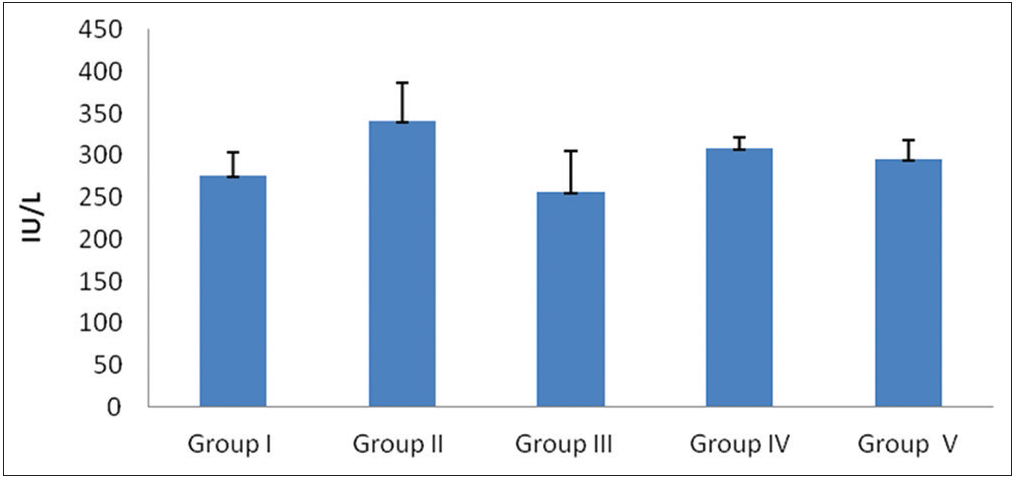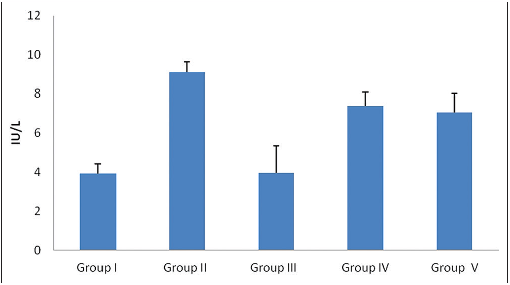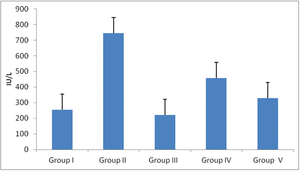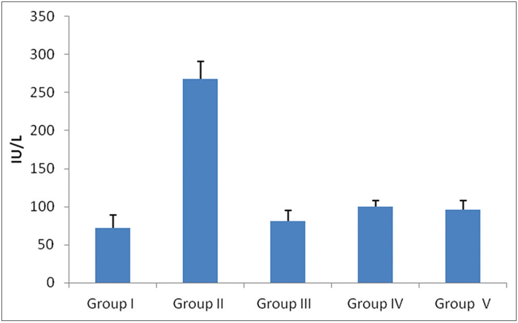 The level of ALT elevation in Group II showed more as compared to Group I. In Groups IV and V showed a decreased level of ALT compared to Group II. However, Group V has very low ALT level than Group IV which is almost close to Group III [Graph 1].