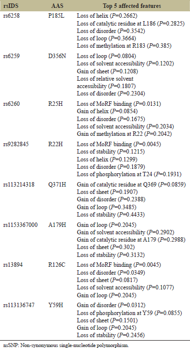 | Table 2: Effect of nsSNP on protein structure and function by Mutpred. [Click here to view] |