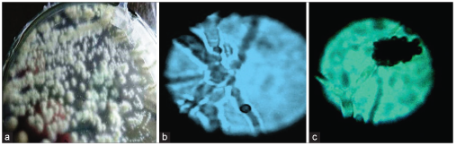 | Figure 2: Photographic images of Streptomyces sp. (a) Colonies of isolate after 5 days of incubation on glucose asparagine medium, (b) and (c) microscopic view of the isolate (×100). [Click here to view] |