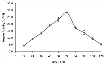 | Figure 3: Production profile of L-asparaginase from Streptomyces sp. [Click here to view] |
