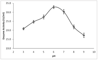 | Figure 7: Effect of pH on L-asparaginase enzyme activity from Streptomyces sp. [Click here to view] |
