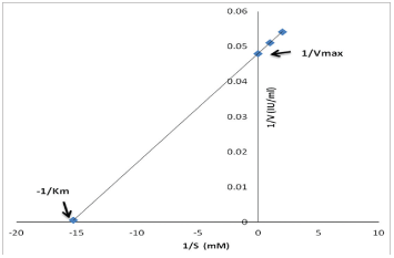 | Figure 9: Lineweaver–Burk plot for L-asparaginase from Streptomyces sp. [Click here to view] |