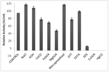 Different salt solutions - sodium chloride (Na+), potassium chloride (K+), magnesium sulfate (Mg2+), calcium chloride (Ca2+), ferrous sulfate (Fe2+), copper sulfate (Cu2+), mercury chloride (Hg2+), and chemicals, namely, dithiothreitol (DTT), SDS, ethylene diamine tetra acetic acid (EDTA), and mercaptoethanol (ME) were used to determine their effect on enzymatic activity. This mixture was incubated at room temperature for 30 min, and then enzyme assay was performed [17-19,21].